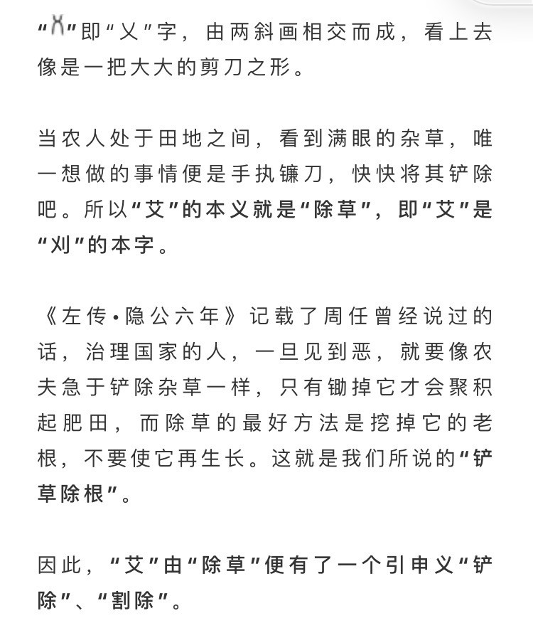 许慎在《说文解字•艸部》中解释“艾”时说:“艾,冰台也。从艸,乂声。”在分析了“艾”字的字形后,我们要说,“乂”应当不仅仅是“艾”的声符,亦是它的形。