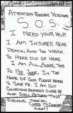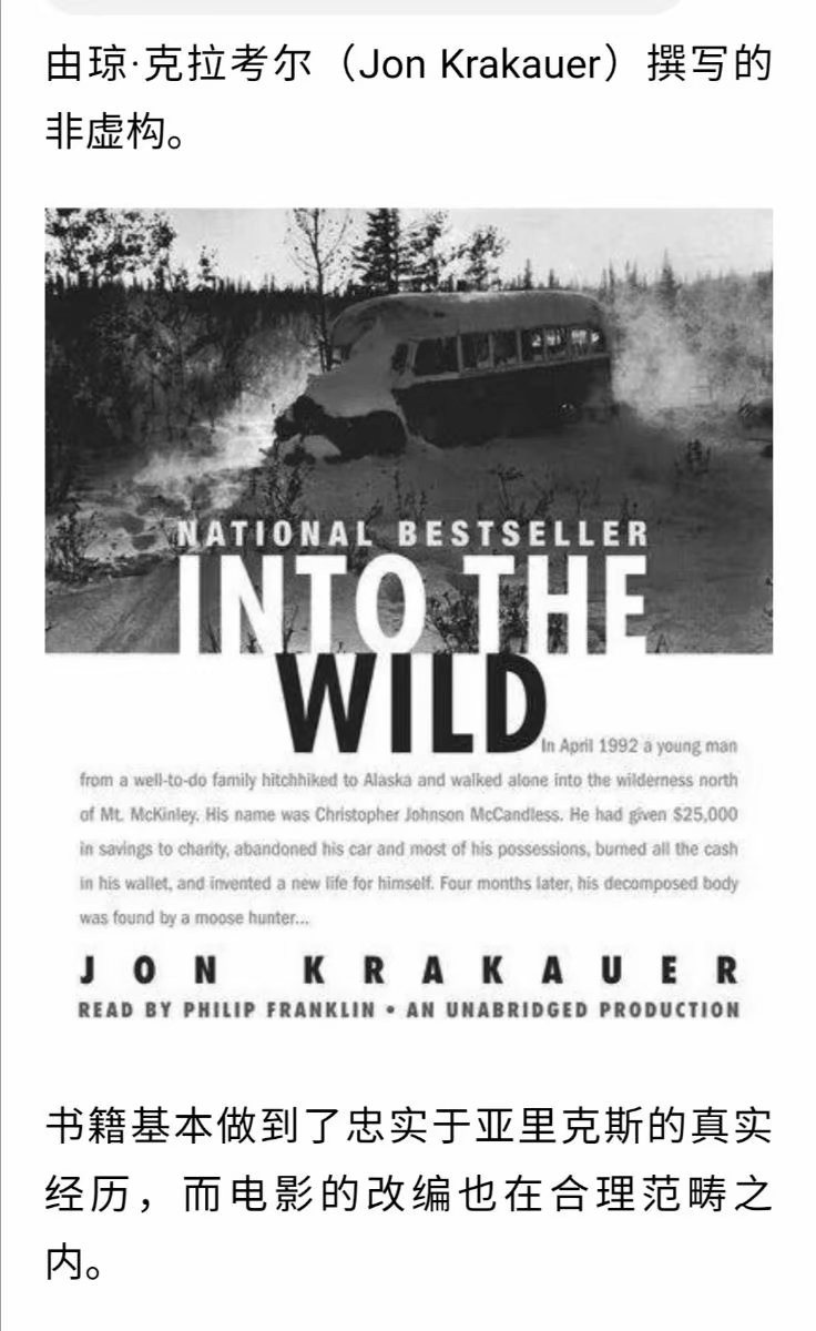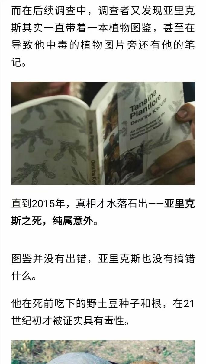 他或许并没有象电影里的克瑞斯那样盲目无措,但电影近乎真实的描述了他的死亡。他在阿拉斯加的车站,买了一本关于当地植物的书,对于他死因的最后结论,倾向于食物中毒。