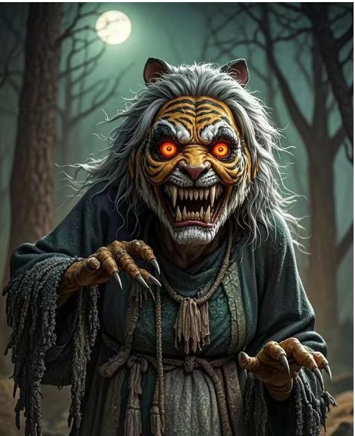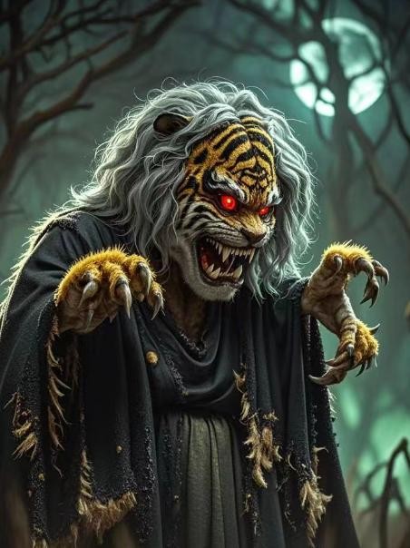 妇人休息好了,就起身要走,突然,那个老太婆从背后扑向妇人,显出它的血盆大口,一口咬住妇人的脖子,吃了起来,一会儿就把妇人吃完了。这老太婆就是老虎精了,吃完妇人后就现出了原形,回山洞睡觉了。