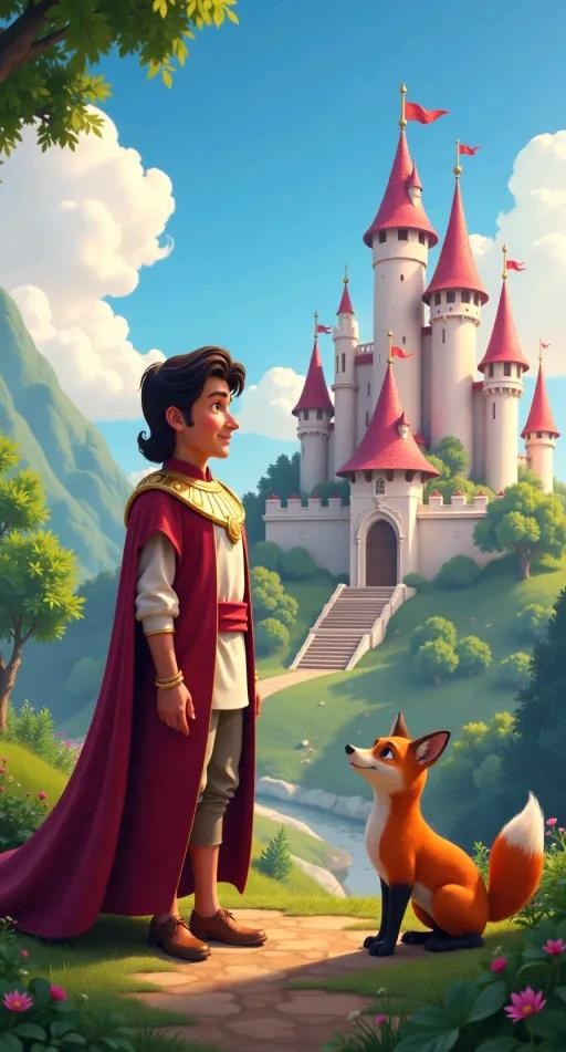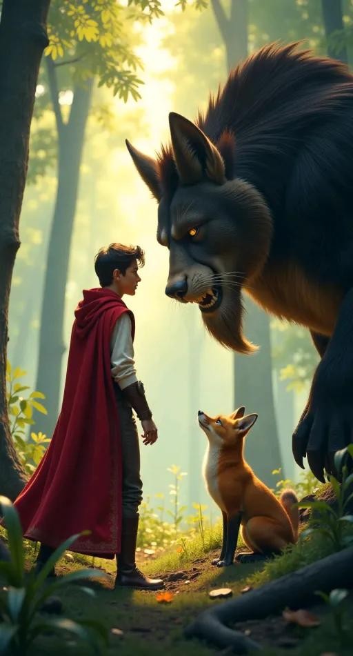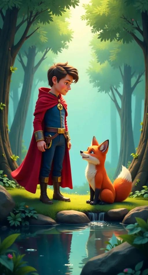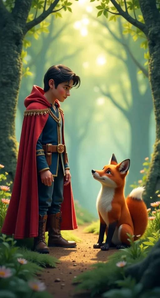 有一天,王子独自骑马到森林中游玩。在森林的深处,他遇到了一只狐狸。这只狐狸毛色火红,眼神灵动,与普通的狐狸有着不一样的气质。