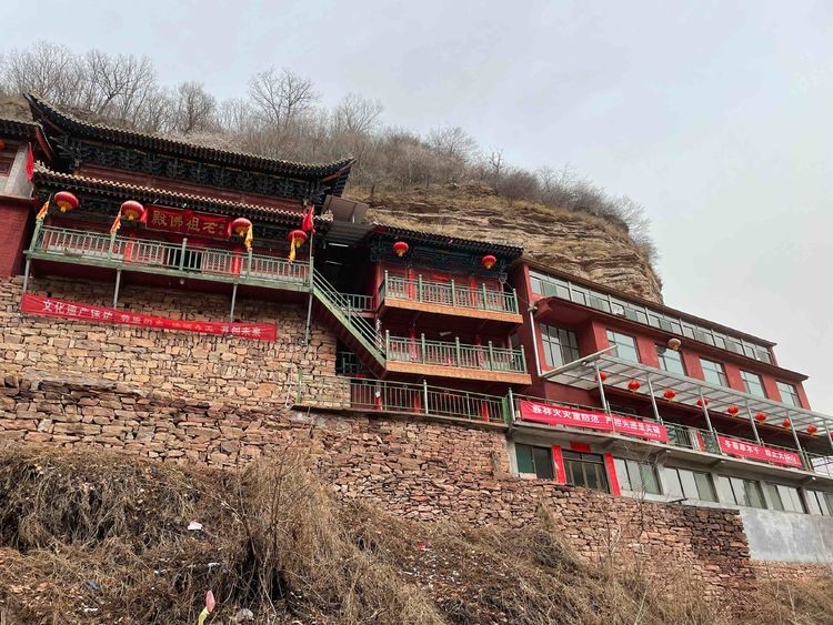 兴匆匆才准备蓄力登山,就稀里糊涂顺着景区路线一路畅通无阻到了老祖殿,依山而建的庙宇,庄严的红墙嵌在红色的山体,远远看去多少有点悬空寺的味道,传说是老祖坐化的地方。对面崖壁中一段路有点像“爬眉”,引驴友们纷纷折腰前往一试。之后我们踏雪而行,穿过一片林地,到一片开阔地集合拍照,开始下山。前半段路程我始终没搞明白哪里是舍身崖,卧虎洞在何处,传说中的南天门呢?!是我们压根没走过,还是我没有一双善于观察发现的眼睛?总之,我有点懵。