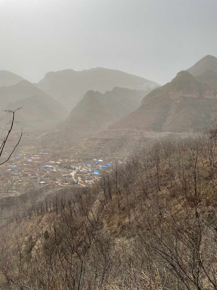 性空山位于黎城县北南委泉乡杏滩村,和驴友从金鸡寨景区进,走过陡直狭窄的石阶,到达红色的山体半山腰,极目远望,周围山势相对柔和,没有南太行的奇雄险峻和凌厉霸气,更多了些象形艺术性,层峦叠嶂,影影绰绰的白色,看不清是残雪还是杏花,山下村庄一览无余。