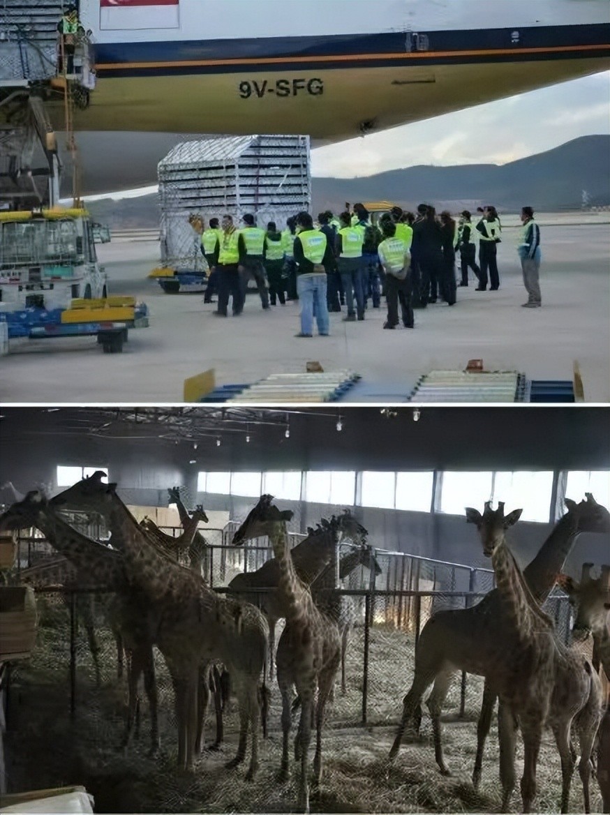 2013年11月26日,23头长颈鹿宝宝从南非乘专机“移民”昆明。飞机上长颈鹿分别住进8间“宿舍”,来昆明路线(南非约翰内斯堡—新加坡 10小时40分钟新加坡—昆明长水国际机场 3个半小时昆明长水国际机场—云南野生动物园 2小时10分钟)。