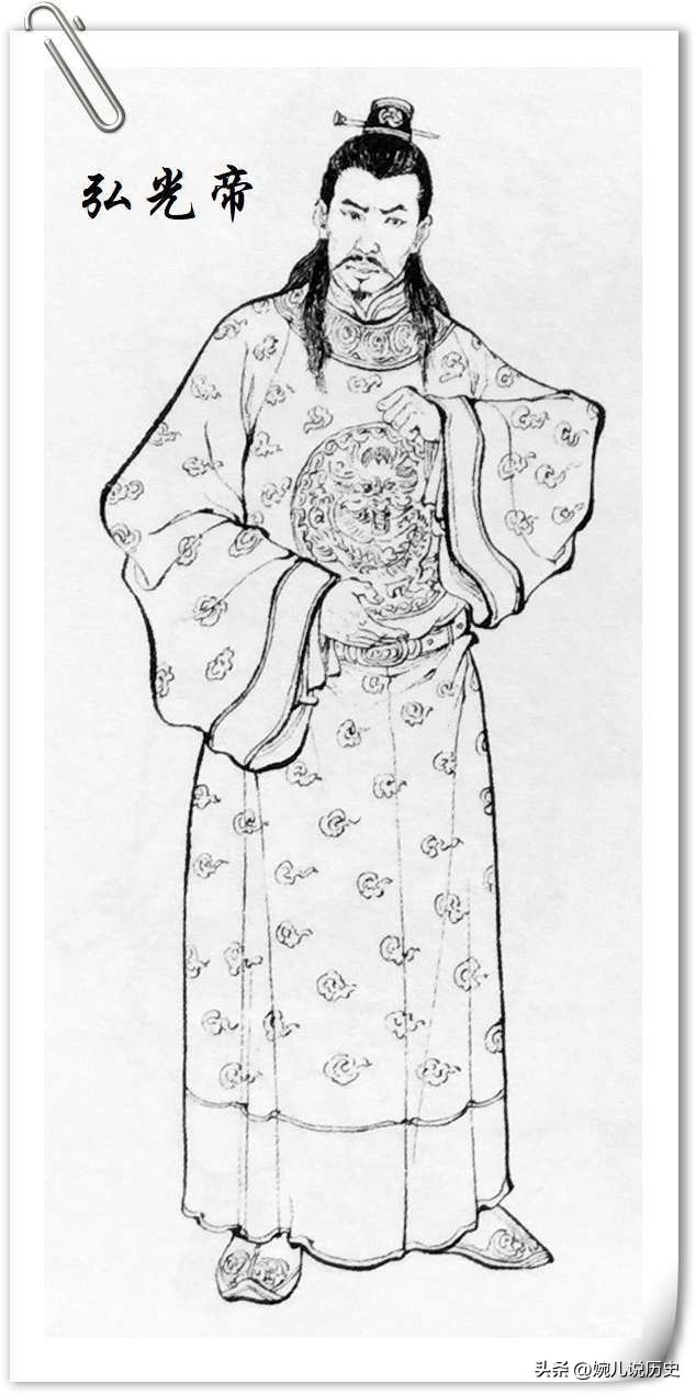 朱由崧即南明弘光帝,在崇祯帝吊死煤山后,弘光帝逃到淮安,此时南京及南方的城市还在明朝的掌控中,在急需立新君的时候,被凤阳总督马士英等拥立于南京监国,继承称帝,建元弘光,史称“南明”。