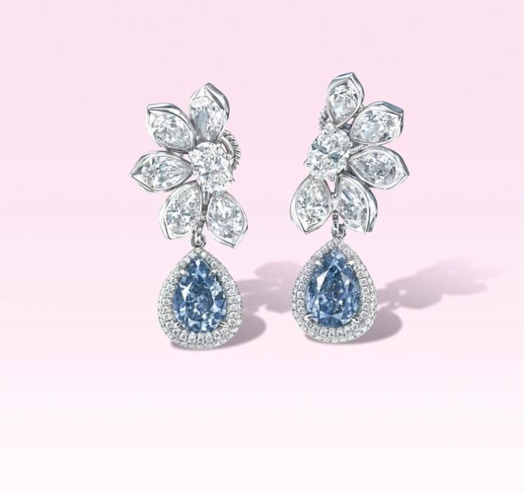 1对分别镶有3.06及2.61克拉梨形切割艳彩蓝钻的珍贵耳环,以5785万港币(约2亿547万元台币)的高价,夺下珠宝类最高成交价宝座。 佳士得提供