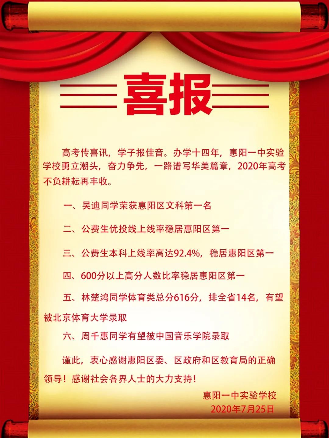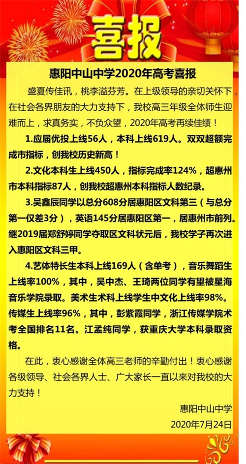 2020年惠州惠阳区各中学高考喜报!中山崇雅实验一中高级共创历史