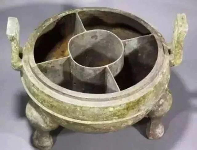 所谓的“五熟釜”,就是将鼎分成五个不同独立的空间,可避免不同味道的料汤串味。各种肉类分放在不同的格内,也方便不同饮食习惯的食客享用,堪称九宫格火锅的前身。