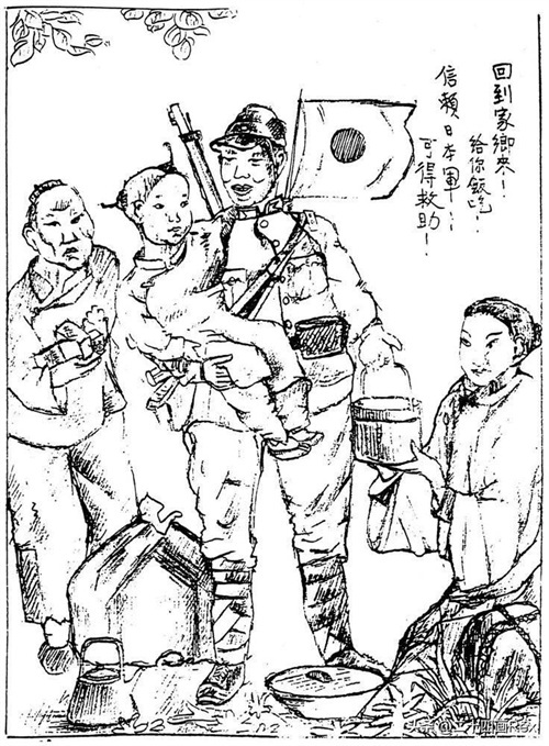 这是日本人的宣传画,“回到家乡来!给你饭吃!信赖日本军!可得救助!”