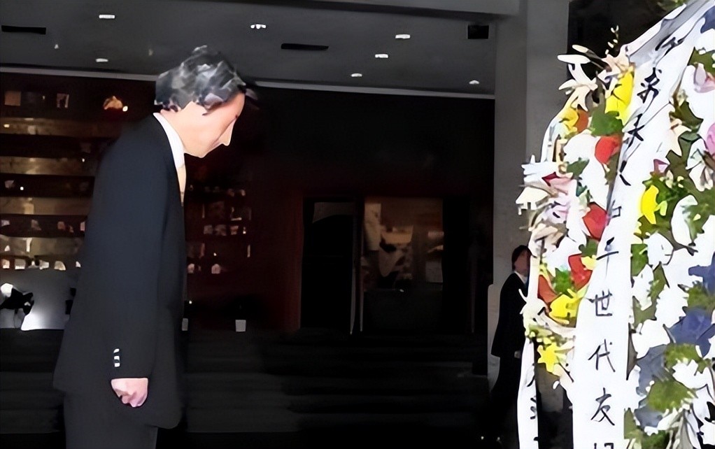 他站在在有抗日军民持枪肃立的“血肉长城”巨幅雕塑前鞠躬、献花圈,并默哀。这是日本政府首脑第一次在这里献花圈,也是第一位在任的自民党首相前来中国人民抗日战争纪念馆参观。