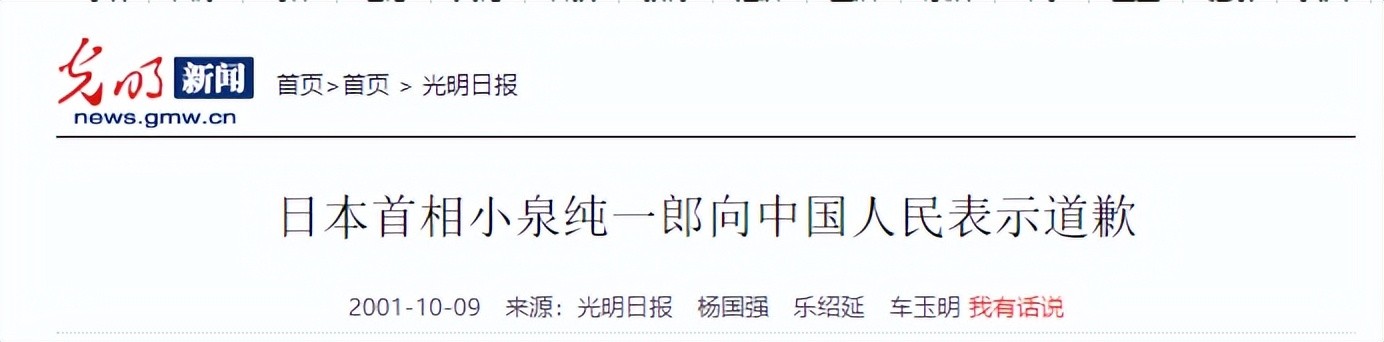 2001-10-09光明网 光明日报 日本首相小泉纯一郎向中国人民表示道歉