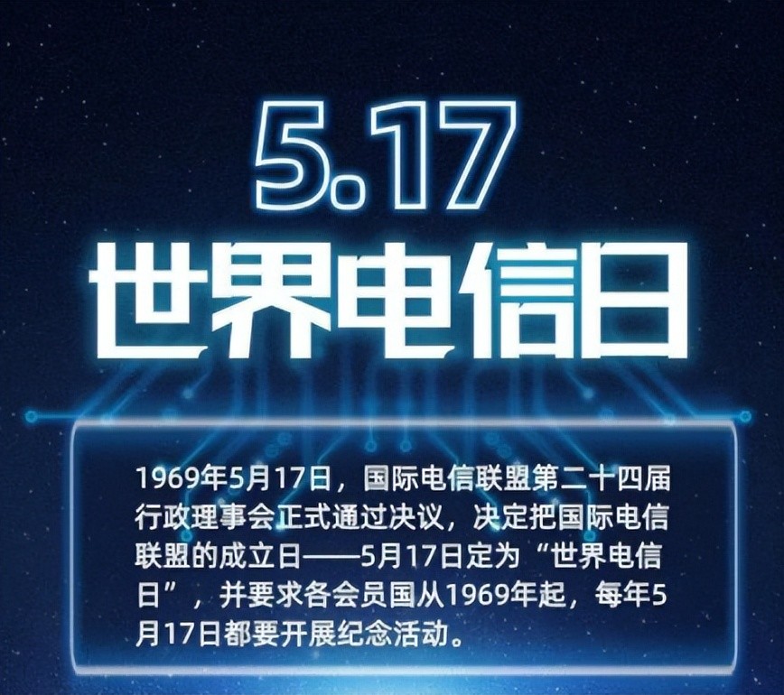 1969年5月17日,国际电信联盟第二十四届行政理事会正式通过决议,决定把国际电信联盟的成立日——5月17日定为“世界电信日”,并要求各会员国从1969年起,在每年5月17日开展纪念活动。