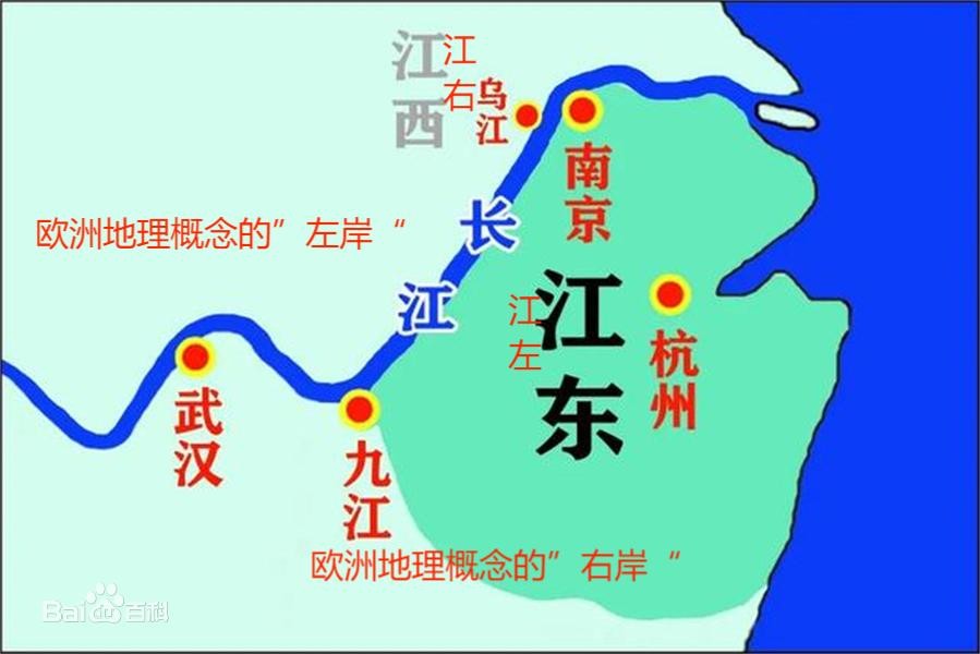我国古代也用到“江左”、“江右”的方位名词,但不同于欧洲以流向为参照的划分。我国古代地理以东为左,以西为右。“江左”指的是江东,也就是“江东子弟多才俊”的项羽故乡。长江流经南京时,流向是西南向东北。以长江为界,南京和南京以东以南的地区是为江东或江左;南京以西和以北的地区是江西或江右。