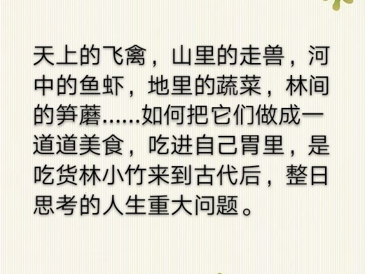 这文里,有很多描写怎么练习厨艺的段落,要知道每种食材的特性,刀工和体力,对火候的掌握,美食不是那么容易做出来的。