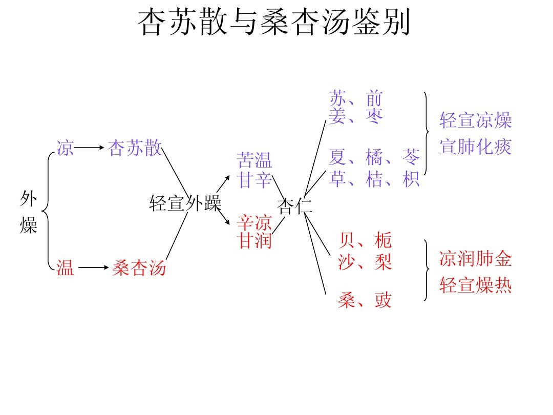 杏苏散与桑杏汤均能轻宣外燥,止咳化痰,用治外感燥证。杏苏散辛宣温润,治外感凉燥,肺气不宣而见恶寒头痛、咳嗽痰稀,鼻塞咽干、苔薄白、脉浮弦者;桑杏汤辛宣凉润,治外感温燥,肺阴受灼而见身热头痛、干咳少痰、口渴舌红、脉浮数者。
