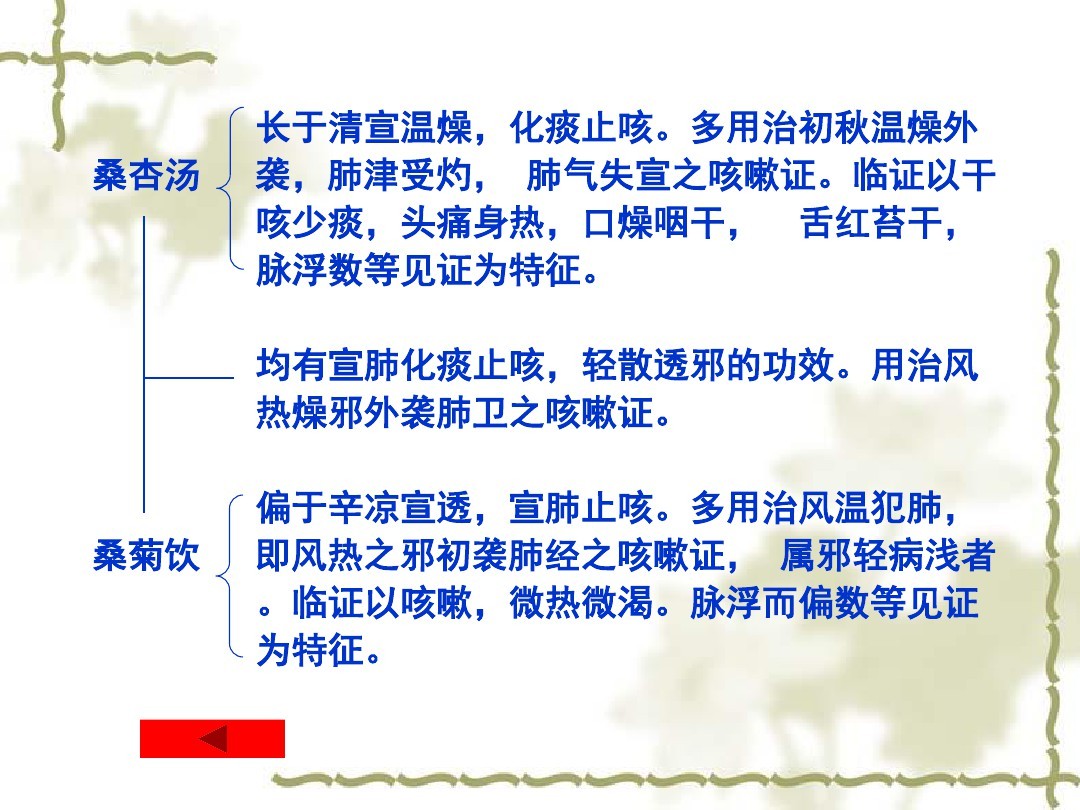 桑杏汤与桑菊饮均属辛凉疏解之剂,均用于外感咳嗽,身不甚热,口渴,脉浮数。桑杏汤辛宣凉润,止咳化痰,主治温燥表证;桑菊饮疏风清热,宣肺止咳,主治风热表证。