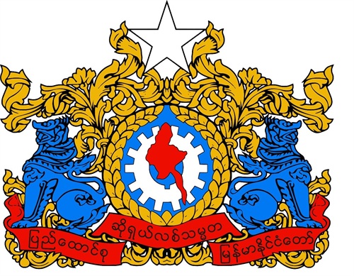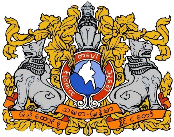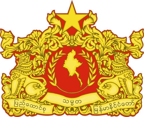 国徽中间为缅甸版图置于橄榄枝中间,两头圣狮为守护兽。两者之间为花卉状图案,顶端为一象征独立的五角星。下方是绶带,写着“缅甸联邦共和国”。