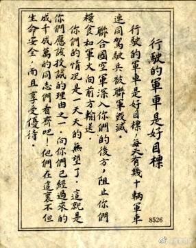 (18)朝鲜战争中,美军针对志愿军运输部队的心战传单《行驶的汽车是联军的轰炸目标》。