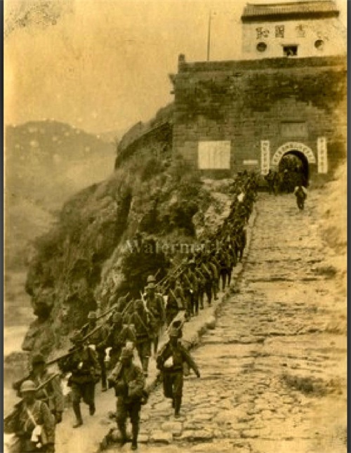 (35)侵华日军占领一地就以抗日军民留下的抗日标语为背景拍摄照片。图6是张家口火车站。
