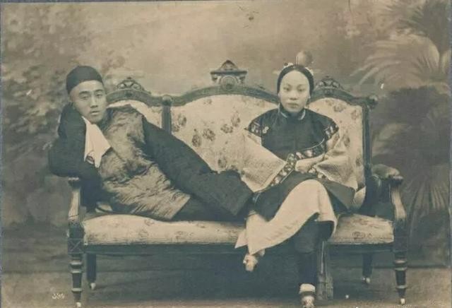 (19)清末摆着妖娆姿势合影的夫妻这男子手里还拿着一个手绢,斜躺坐在沙发之上。他这个姿势,真是妖娆啊。毫无阳刚之气,看起来怪怪的。