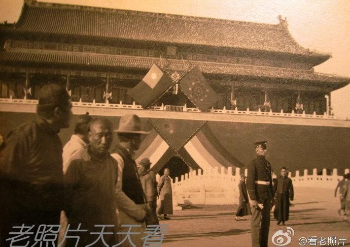 (04)《老照片天天看457——百年前,天安门的历史性的瞬间》 - 图片说明为1912年。从天安门城墙上悬挂的五色旗;从城楼上悬挂的九星旗和早期的青天白日满地红旗看应该拍摄于辛亥革命后不久。照片