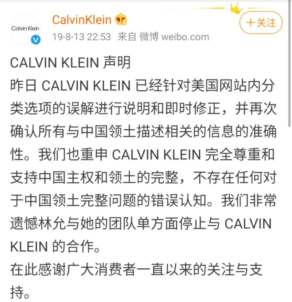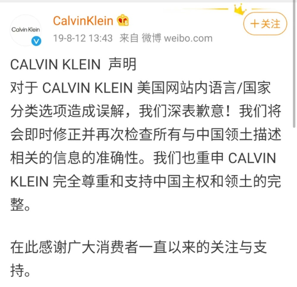 同样在13日当晚,CK官网发布声明,已经针对美国网站内分类选项的误解进行说明和及时修正,“我们也重申CALVIN KLEIN 完全尊重和支持中国主权和领土的完整,不存在任何对于中国领土完整问题的错误认知。”