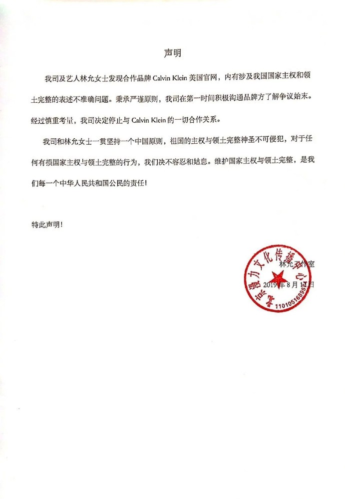对于林允解约一事,CK是这样表达的:“我们非常遗憾林允与她的团队单方面终止与Calvin Klein的合作。”