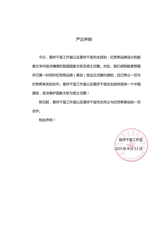 2019年8月,继范思哲、蔻驰(Coach)后,法国高奢时装品牌纪梵希被曝出发行了不尊重中国主权的T恤。在纪梵希官网上,T恤将香港和台湾作为独立板块和国家并列。此事引起热议,品牌代言人易烊千玺发布声明,与纪梵希解约。