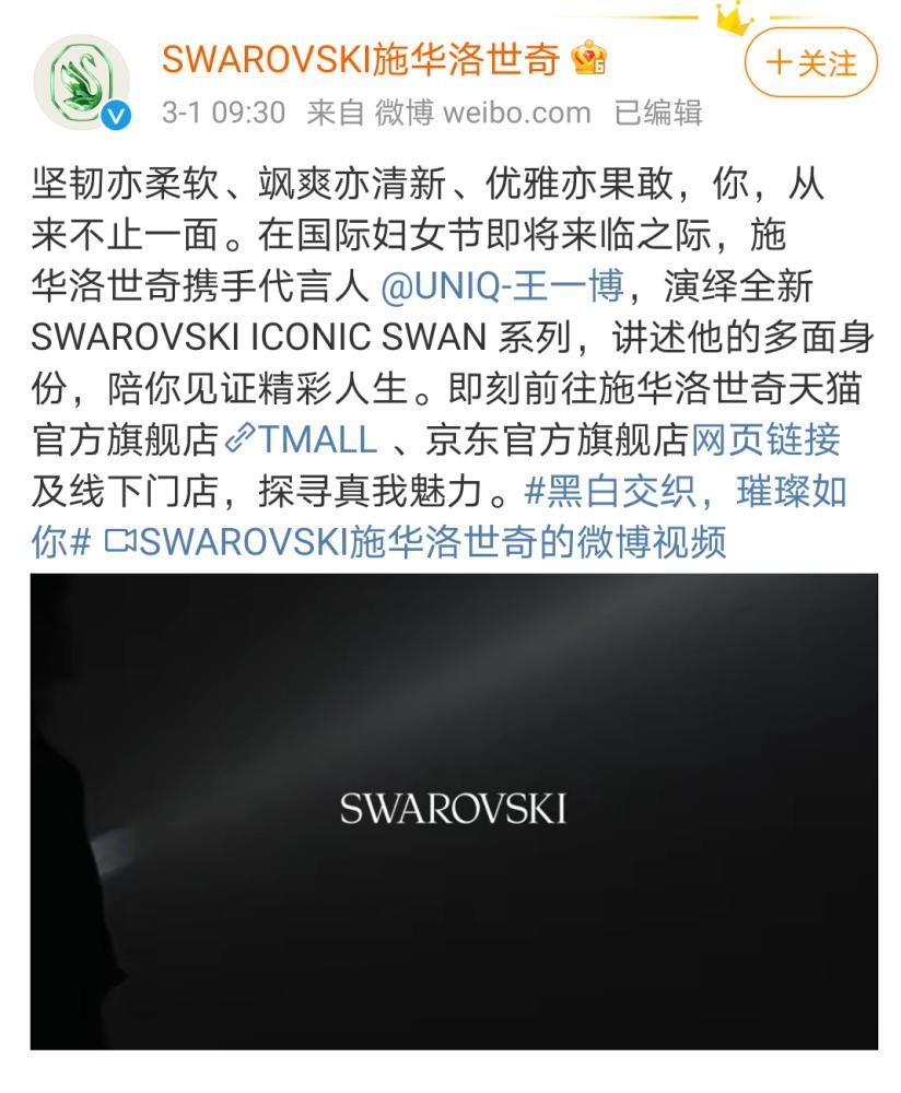 无独有偶。与范思哲一样,时隔两年,施华洛世奇于今年3月1日正式官宣代言人为王一博。