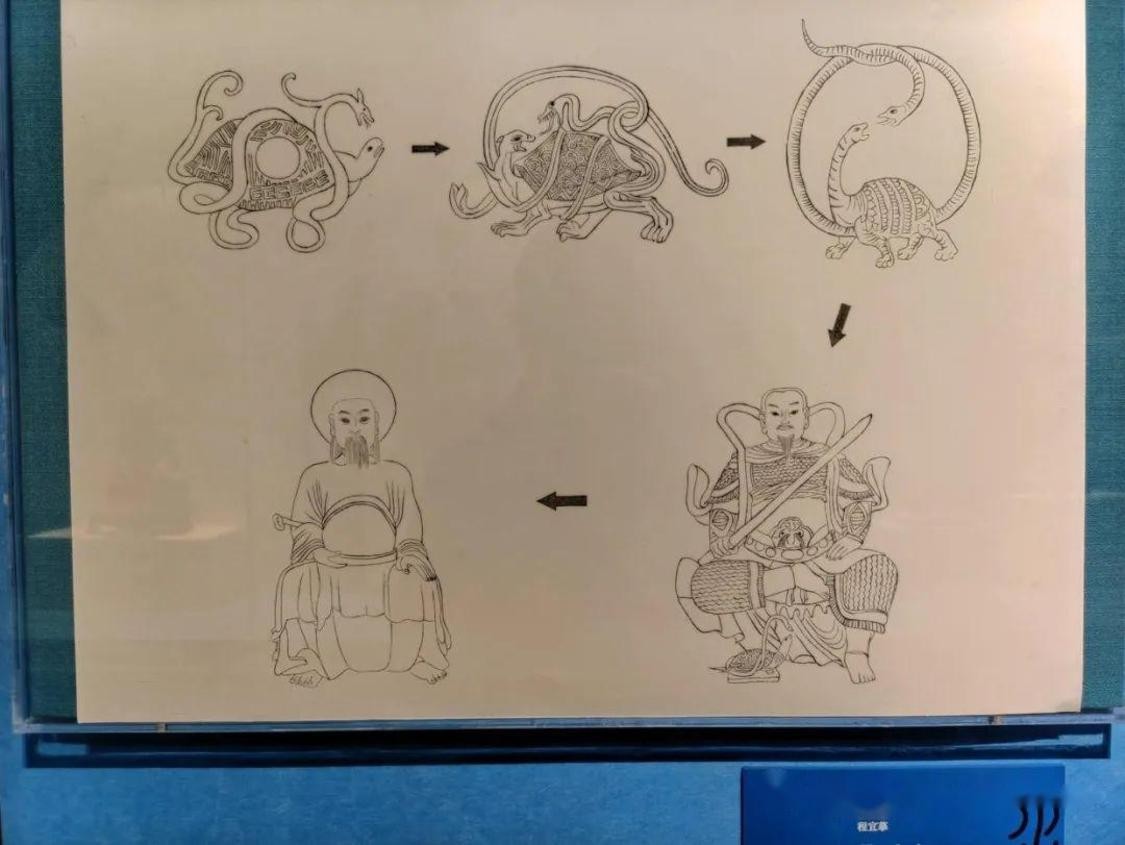 与其他民间信仰神一样,真武经过了曲折的塑造过程:起源于北斗崇拜(星宿神),到秦汉玄武的龟蛇紧缠(四像:青龙、白虎、朱雀、玄武)崇拜,升仙,逐渐人格化,宋时演变成脚踏(放)龟蛇的道教神祗,最后形象完成由武到文的转变。