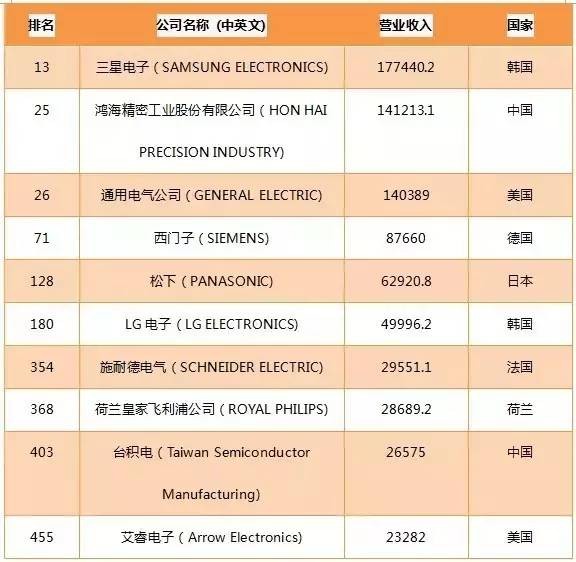 就照明行业(或涉及LED领域的企业)而言,三星电子(排名13)、鸿海精密(排名25)、美国通用电气(排名26)、西门子(排名71)、松下(排名128)、LG电子(排名180)、施耐德电气(排名354)、皇家飞利浦公司(排名368)、台积电(排名403)、艾睿电子(排名455)均入选了排行榜。上榜的这几家企业有的属于照明电工领域,有的则涉足半导体及半导体设备领域。