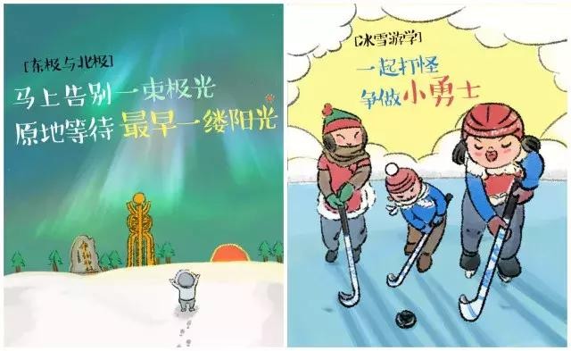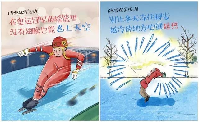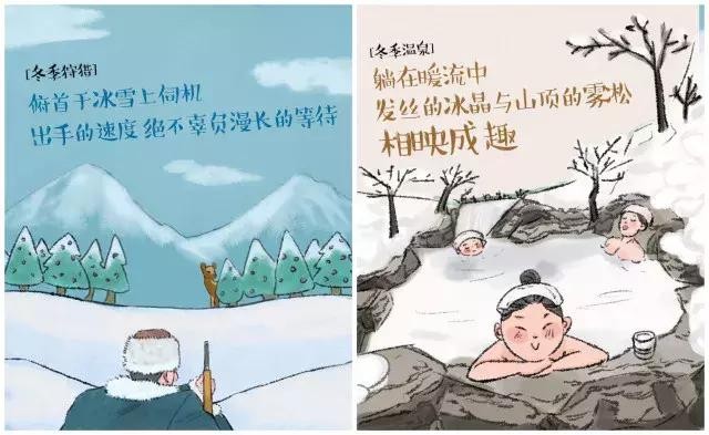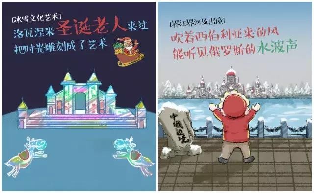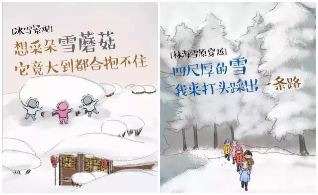 观看专业的冰雪运动赛事、泼水成冰、穿越林海雪原、泡泡温泉、看巨大的“雪蘑菇”、和圣诞老人亲密接触……丰富多彩的玩法呈现在十张手绘中。