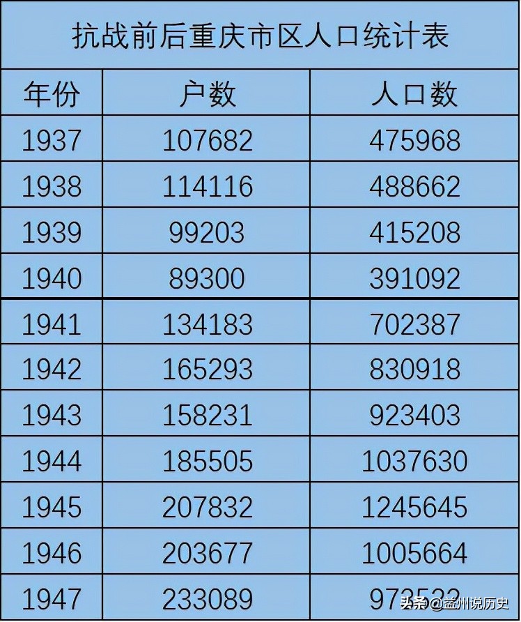 本文主要是讲重庆市区抗日战争前后人口数量的变化,大家看1937年重庆市区人口是47万多,那实际上,是重庆的一部分,1925年时巴县全县人口是974365人,接近百万。1929年重庆设市后,市区人口很快从二三十万增加到四十七万多,说明重庆设市还是推动了重庆的发展。抗战时期,人口又很快增加,人口数超过百万,最多到一百二十几万,增加部分主要是全国来到后方的人,主要是江浙和两湖的人员,当时重庆人称他们为下江人。抗战胜利后,很多外地人又回到家乡,可以看到重庆市区人口数在下降,不过下降不是很多,说明还是有很多外地人留在了重庆,为建设重庆作贡献。解放后,到现在,重庆发展很快,重庆市区又扩大很多,现在是重庆绕城高速以内都是主城,人口也过千万了。