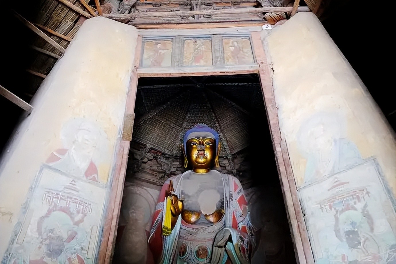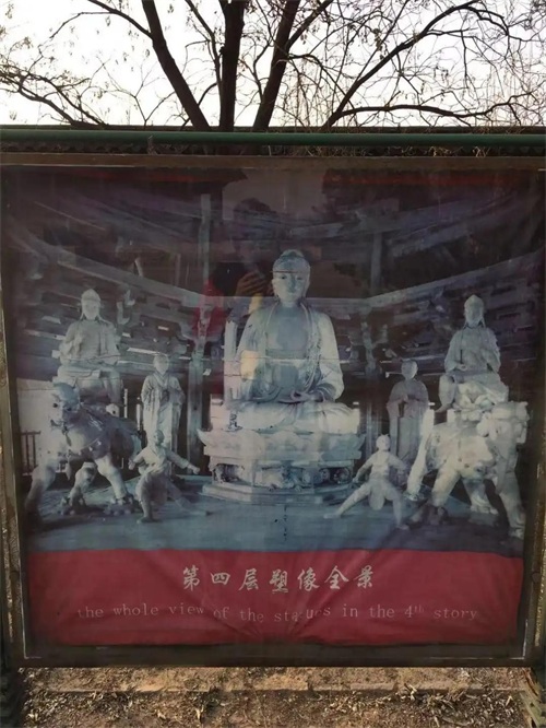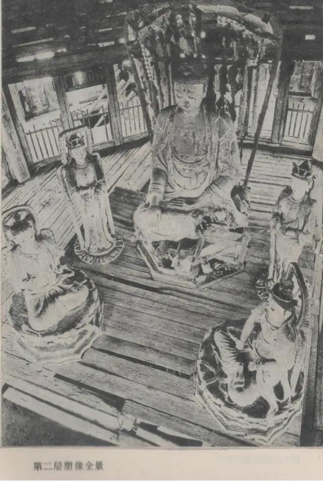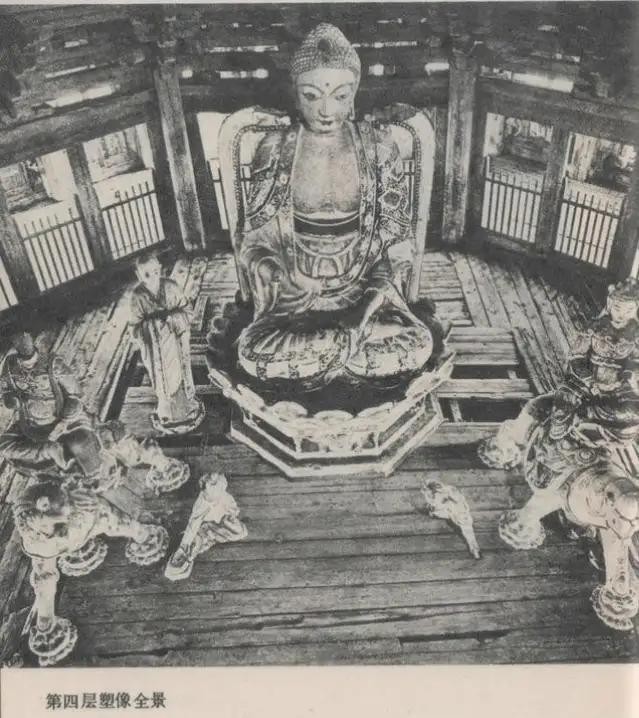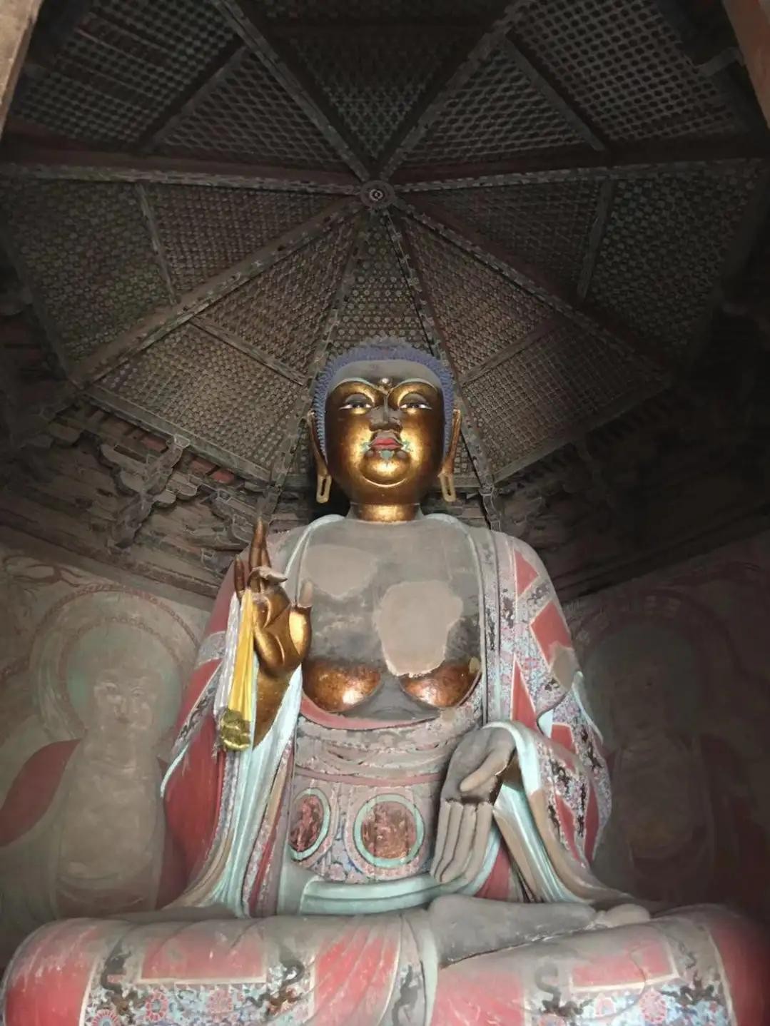 这是木塔二层的主佛像。在1974年,也就是秦始皇陵兵马俑被发现的那年,该佛像胸口被盗挖,佛像内的文物失窃。最后认定窃贼是两个负责维修木塔的木匠,他们在佛像胸部偷走了著名的佛牙舍利和水晶珠。