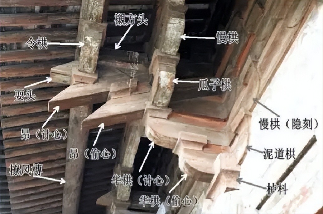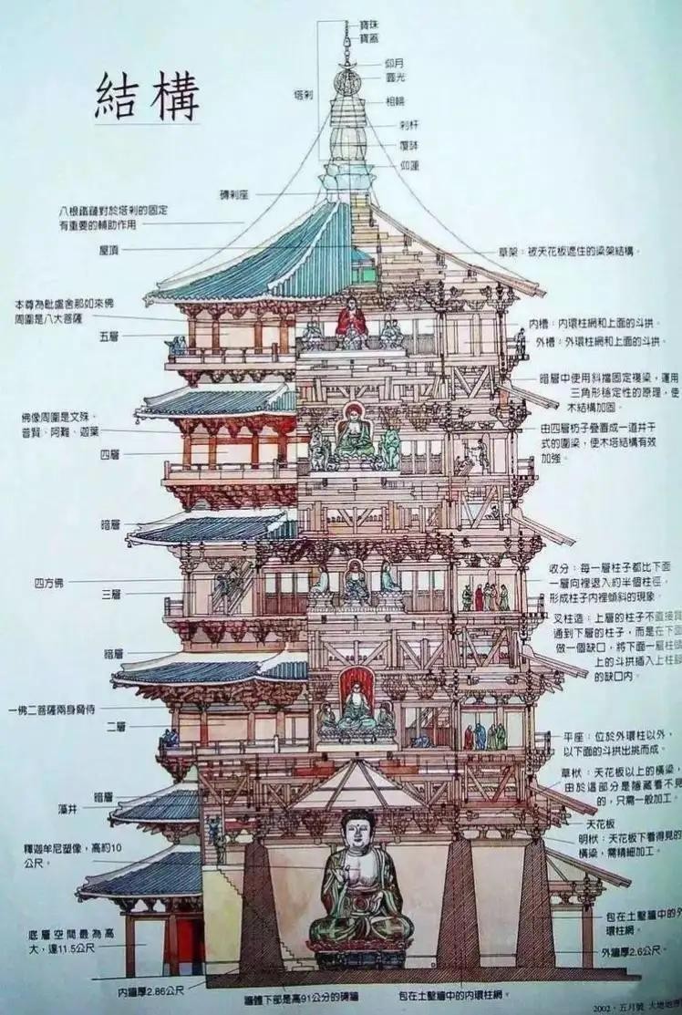 应县木塔的每一层,都有由撑木构成的环状结构,该结构被屋檐遮挡,从外部无法看出,形成暗层,防止位移变形。
