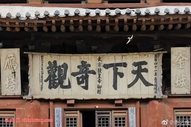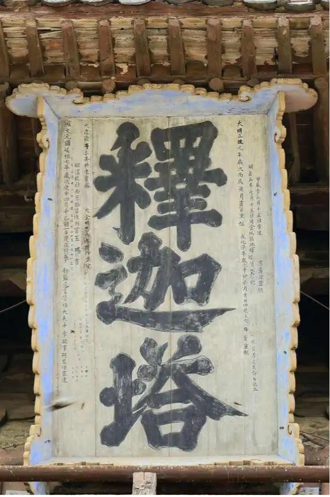 释迦塔这个最著名的牌匾上记载了“大辽清宁二年特建宝塔,大金明昌六年增修益完”。这应该是木塔修建年代最为可靠的记录了。这块牌匾也是记录应县木塔修建年代的唯一实物。