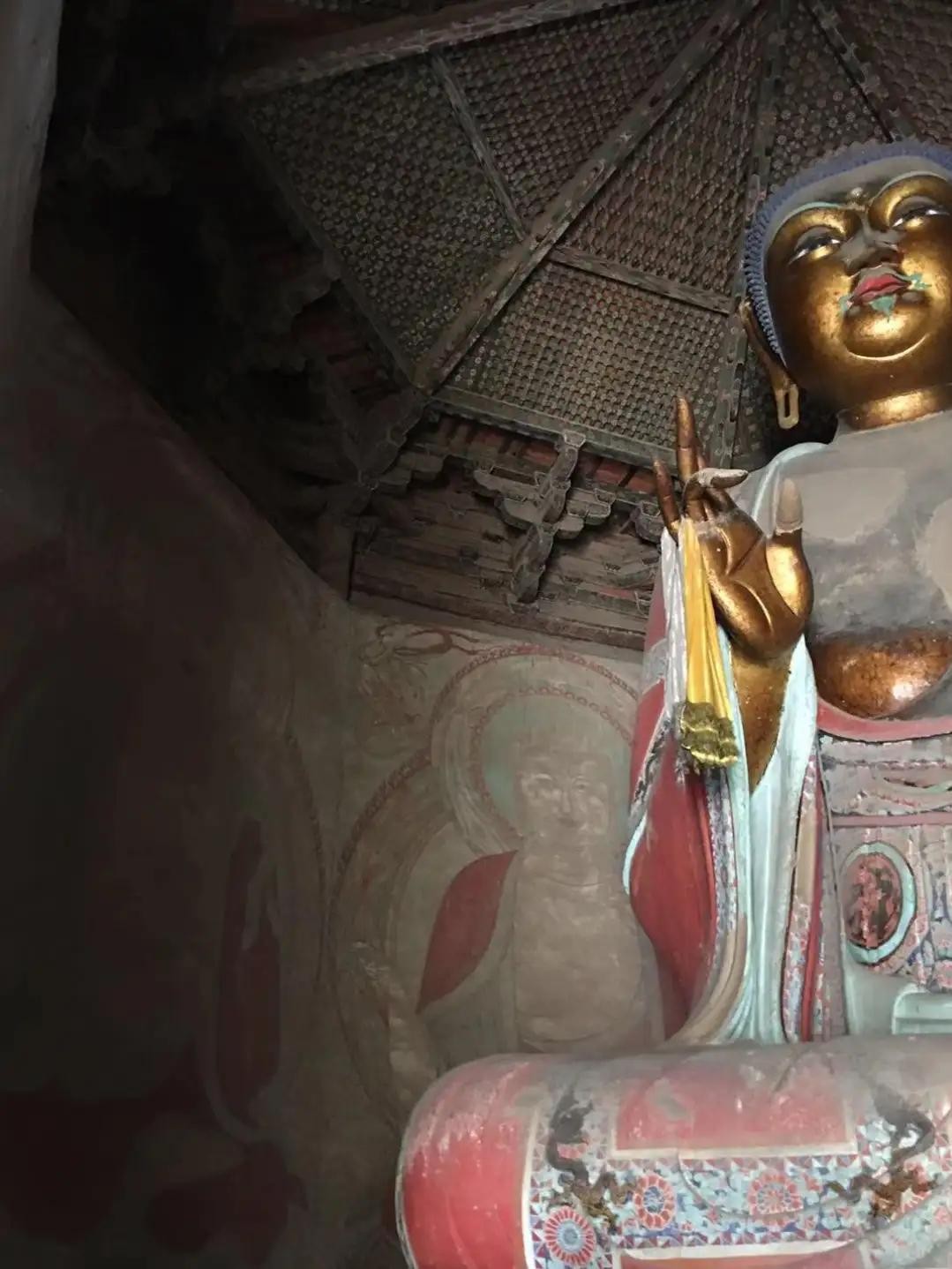 该佛像在文革期间遭遇破坏,红卫兵曾攀爬而上。佛祖下垂的左手手指就是那段岁月失落的,现在的手指为后修,很明显与上举的手相比不太协调。整座木塔各层佛像大大小小共34尊。