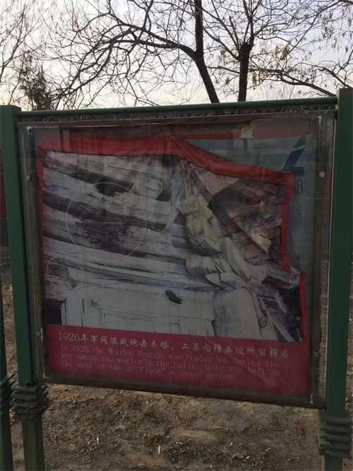 据记载,1926年冯玉祥和阎锡山的军队在应县大战,应县木塔中弹200余发。1948年应县解放时,木塔被12发炮弹击中,造成了木塔严重倾斜。这种倾斜度,肉眼是可以辨识的。木塔内部的柱子至今还有许多枪眼和炮弹击中毁损的痕迹。