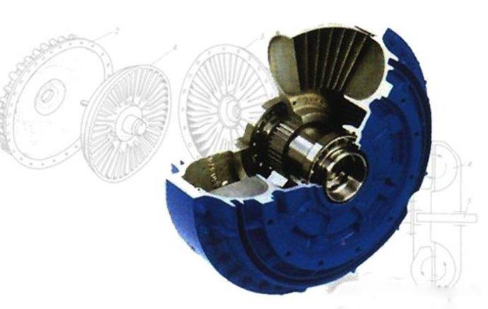 液力偶合器主要由壳体、泵轮和水轮机组成。液力偶合器有多种结构形式,不同液力偶合器的结构和原理略有不同,但基本原理是一样的。它们通过泵轮将机械能转化为液体动能,然后流动的液体冲击涡轮,涡轮将液体动能转化为机械能,向外界输出动力。液力偶合器的详细工作原理是:发动机运转时,曲轴带动液力偶合器的外壳和泵轮一起转动,泵轮叶片中的液压油由泵轮带动转动。在离心力的作用下,液压油被甩到叶轮叶片边缘,冲到涡轮叶片边缘,使涡轮在液压冲击力的作用下旋转;流向涡轮叶片的液压油沿涡轮叶片的内缘流动,返回泵轮内缘的液压油被泵轮再次甩向外缘;这样液压油从泵轮流向涡轮,再从涡轮流向泵轮,形成循环液流。