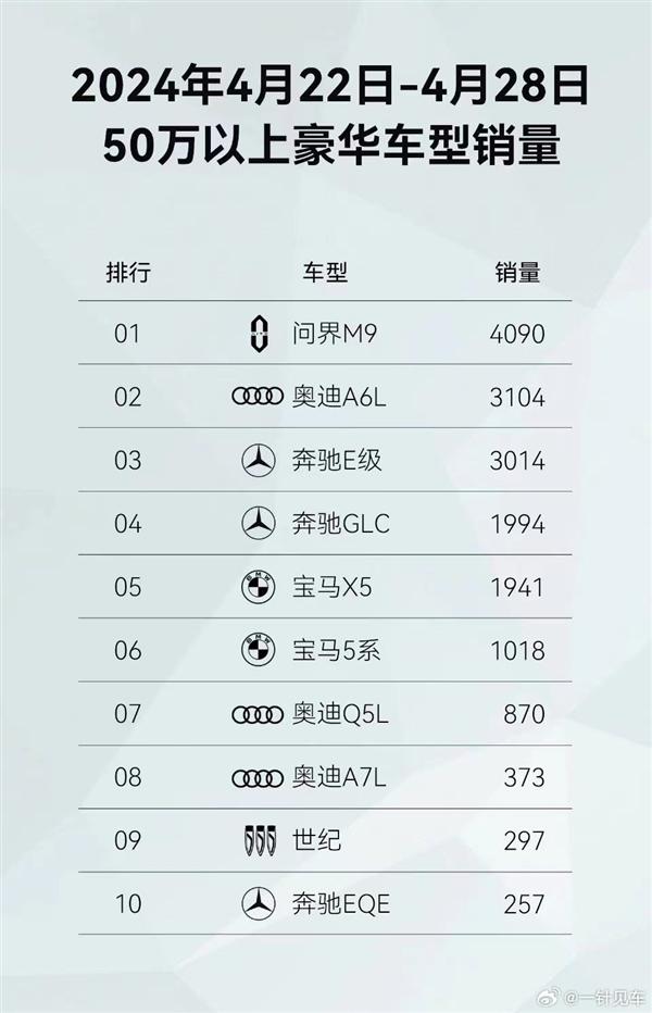 具体来看,在上一周,问界 M9 销量为 4090 辆,超过奥迪 A6L、奔驰 E 级、奔驰 GLC、宝马 X5、宝马 5 系、奥迪 Q5L、奥迪 A7L、别克世纪、奔驰 EQE 等。
