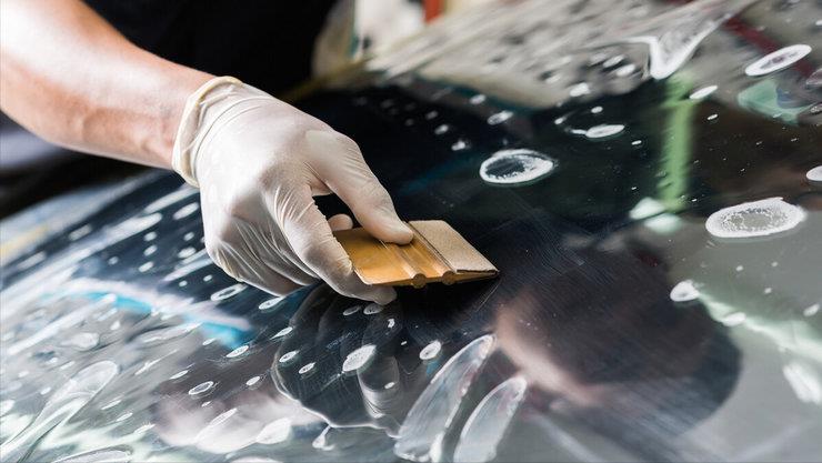 汽车贴膜分为:清洁玻璃、裁剪车膜、车膜定型、车膜粘贴、质量检查等5个步骤。清洁玻璃:需要先用具有清洁作用但不包括化学物质的水清洗玻璃以及玻璃边缘,反复清洗以确保清洗干净;随后用刮干板按照从干的一面刮向湿的一面、从上到下的顺序刮干玻璃,用布擦干边缘。裁剪车膜:按照玻璃的实际尺寸裁剪车膜。事先准备好车型玻璃样板,根据样板裁剪车膜。车膜定型:车膜裁剪完成后,覆在玻璃外侧,用热风枪在需要定型的部位加热,同时用刮片将车膜紧贴在玻璃上。粘贴车膜:车膜定型后,贴在玻璃内侧,撕掉车膜衬垫,当衬垫完全揭下时,将膜贴在玻璃上,调整左右的长度不碰到车框;往膜的背面喷清水,从上到下、从中心到边缘刮出水分,最后用毛巾擦干。质量检查:检查是否粘贴牢固、车膜与玻璃之间是否有气泡等。
