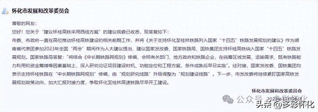 网友都很关心怀化到桂林高铁建设,不久前,针对网友提出的关于“建议怀桂高铁采用西线方案”的建议,怀化市发改委有了答复:市委、市政府一直在高位推动怀桂高铁建设的相关前期工作,并将《关于支持怀化至桂林铁路列入国家“十四五”铁路发展规划的建议》作为湖南省代表团参加2023年全国“两会”期间作为人大建议提出,建议国家发改委、国家铁路局、国铁集团支持怀桂高铁纳入国家“十四五”铁路发展规划。