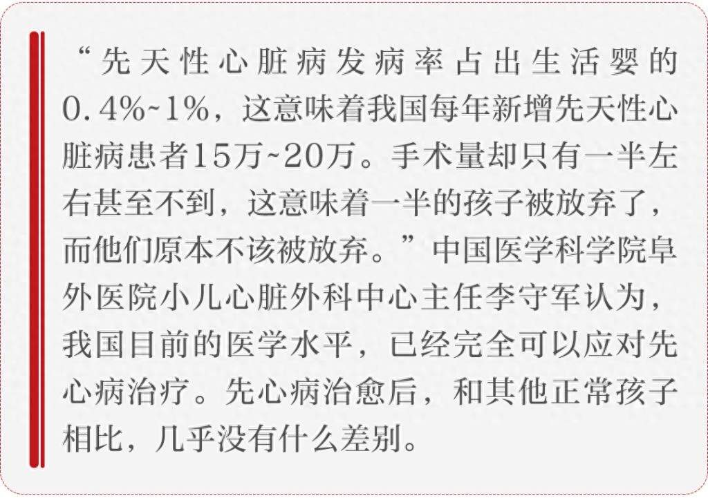 “先天性心脏病发病率占出生活婴的0.4%~1%,这意味着我国每年新增先天性心脏病患者15万~20万,手术量却只有一半左右甚至不到,这意味着一半的孩子被放弃了,而他们原本不该被放弃。”李守军认为,我国目前的医学水平,已经完全可以应对先心病治疗。