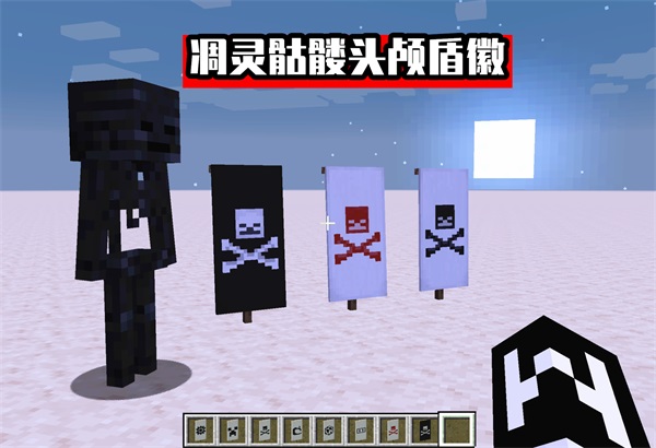 一股浓浓加勒比海盗风格的盾徽,一只小白的头颅下方是一对交叉的骨头。严重怀疑这块盾徽设计是为了将来旗帜可以插在船上,在大海行船当海盗使用的。这里需要用一个在生存模式下比较少见的材料:凋灵骷髅头颅;本人生平在《我的世界》最讨厌刷的两种材料:恶魂之泪,凋灵骷髅头。完全没有技巧可言,带上一把掠夺剑,剩下的全交给脸。