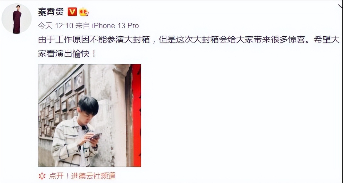不久,人气正旺的秦霄贤发文,内容同样是“因为工作原因不能参加……”