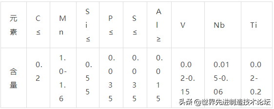 Q345D:C≤0.20,Mn ≤1.7,Si≤0.55,P≤0.030,S≤0.030,V 0.02~0.15,Al≥0.015;