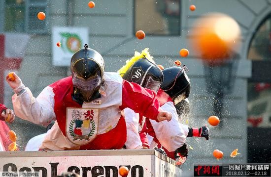 当地时间2月11日,意大利伊夫雷亚小镇举行橙子狂欢节,参与者互扔橙子展开“橙子大战”欢乐无限。