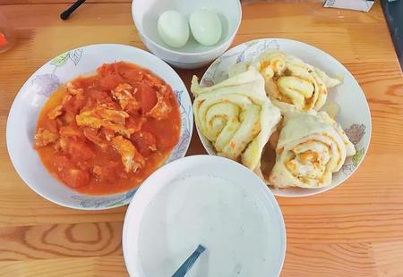 这一种也是非常简单的做法,花卷是提前一天做好的。因为这个花卷需要发面,时间比较长。二姐是提前做好放到冰箱中冷藏的,第二天热一下就可以了。西红柿炒鸡蛋只要十分钟,所以整个早餐不到二十分钟就可以了,这次的早餐也非常的简单方便。