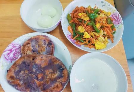 第四种:紫薯饼、胡萝卜青椒炒鸡蛋、牛奶和鸡蛋。