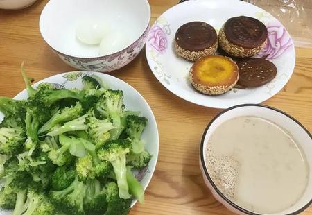 第三种:牛奶燕麦、凉拌西兰花、红糖饼和鸡蛋。