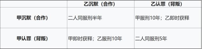 如果,一个人检举对方(也就是背叛),另一个人保持沉默(合作),那检举的人立即释放,被检举的人则要被判10年监禁。